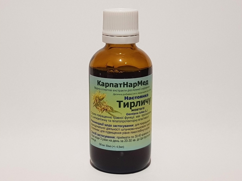 |     Настоянка Тирличу жовтого       Горечавка жёлтая - Gentiana lutea  (L.) - Тирлич жовтий (джинджура, джiн-джура, джинджорик, гiндура, гінзура, гиндул, гиндзур, горчанка жовта, кінзура, розмай зілля, свiчурник жовтий, лиходій, лихоманник, маточник, тинтява жовта, таралишник, товстуля)     Химический состав. Корень Горечавки желтой содержит  горькие гликозиды (генциопикрин, амарогентин), желтый краситель гентизин,  алкалоиды, трисахарид генцианозы, дисахарид генциобиоза, жирное масло, смолистые  и пектиновые вещества, аскорбиновую кислоту.     Препараты Горечавки желтой улучшают функциональную  деятельность пищеварительных органов (возбуждают аппетит, стимулируют секрецию  желудочных желез, усиливают моторику пищеварительного канала), имеют  противовоспалительные и антисептические свойства, обнаруживают глистогонное  действие на Toxocara canis. Экспериментальными исследованиями установлены  желчегонное и желчеобразовательное свойства препаратов горечавки, их способность  усиливать сокращение сердца (увеличивается амплитуда сердечных сокращений).  Особенно эффективным является применение Горечавки желтой при нарушениях  пищеварения, которые сопровождаются отсутствием аппетита, ахилией и  диспепсическими явлениями, при панкреатитах, изжоге, отрыжке, катаре желудка,  метеоризме, диарее, привычных запорах, гастрите, язвенной болезни желудка,  колите; снижении активности ферментов поджелудочной железы, сахарном диабете  (стимулирует инсулино-образовательную функцию), улучшает моторику  пищеварительного тракта; применяют и при анемии и золотухе. Кроме того,  Горечавка желтая является эффективным укрепляющим в общих чертах средством для  реконвалесцентних больных, выздоравливающих после тяжелых болезней, – укрепляет  иммунную систему организма. Как растительная горечь-анаболик, используется для  наращивания мышечной массы (1–1,5 кг за месяц приема). Горечавку желтую  применяют при нарушениях обмена веществ, подагре, артритах разного  происхождения. Употребляют для увеличения количества молока у женщин, которые  кормят грудью.     Горечавка желтая применяется при заболеваниях печени и  желчевыводящих путей (цирроз печени, гепатит, холангит, холелитиаз, все виды  холециститов, в том числе лямблиозный). Горечавка защищает мембраны клеток  печени от разрушения (гепатопротекторные свойства), снижает уровень холестерина  в крови при его высоком уровне при атеросклерозе. Используют Горечавку желтую  при воспалении и наличии песка в почках и мочевом пузыре. Успешно применяется  при заболеваниях органов кроветворения: стимулирует выработку эритроцитов и  повышает уровень гемоглобина в крови, влияя на костный мозг и селезенку.  Является противоаллергическим средством.     С целебными свойствами Горечавки желтой (джинджуры) может  посоревноваться разве что знаменитый женьшень. Вообще о чудодейственных  лекарственных свойства джинджуры люди знают уже более 2000 лет. В народной  медицине Горечавку желтую употребляют для общего укрепления организма,  стимулирования деятельности печени и желчного пузыря, при бледной немощи у  недостаточно развитых девушек, при цинге и артрите разного происхождения,  болезнях селезенки, желтянке, изжоге, отрыжке и катаре желудка, от метеоризма,  дизентерии и запоров; как жаропонижающее средство при простудн