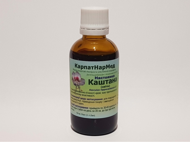 |     Настоянка Каштана (квіти)       Каштан конский (жёлудник, эскулус) - Aesculus  hippocastanum (L.) - Кінський каштан (гіркокаштан)     Химический состав. Все части каштана  конского содержат целебные вещества: