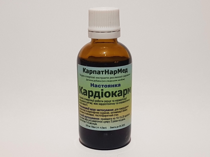 |     Hастоянка "КАРДІОКАРМ" сприяє стимуляції роботи серця та нормалізації серцевого ритму; має кардіотонічну та спазмолітичну властивості.      Склад: водно-спиртовий екстракт суміші собачої кропиви, жовтушнику сіруватого, горицвіту весняного, валеріани лікарської, глоду криваво-червоного, конвалії травневої (1:10). Екстрагент: спирт етиловий 40%.     Рекомендації щодо застосування: для покращення кровотоку в коронарних судинах, оптимізації обміну речовин в міокарді; постінфарктний стан.     Спосіб застосування: приймати по 10-15-20 крапель під язик або на шматочок цукру 2 рази на день протягом 1-6 місяців.     Дієтична добавка (не є лікарським засобом).     Протипоказання та застереження щодо споживання: індивідуальна чутливість до компонентів, вагітність, період лактації, дітям до 12-ти років.     Не перевищувати рекомендовану добову дозу.     Перед застосуванням рекомендована консультація лікаря.     Не слід використовувати як заміну повноцінного раціону харчування.     УВАГА! САМОЛІКУВАННЯ МОЖЕ БУТИ ШКІДЛИВИМ ДЛЯ ВАШОГО ЗДОРОВ'Я!