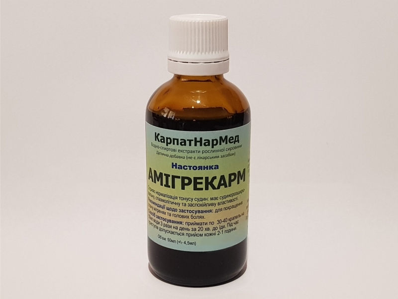 |     Hастоянка "АМІГРЕКАРМ" сприяє нормалізація тонусу судин: має судинорозширювальну, спазмолітичну та заспокійливу властивості.     Склад: водно-спиртовий екстракт суміші іван-чаю, розмарину лікорського, лаванди колоскової (1:10).     Рекомендації щодо застосування: для покращення стану мігренях та голових болях.     Спосіб застосування: приймати по 30-40 крапель на 50мл води 3 рази на день за 20 хв. до їди протягом місяця. Під час приступів допускається прийом кожні 2-1 години.     Дієтична добавка (не є лікарським засобом).     Протипоказання та застереження щодо споживання: індивідуальна чутливість до компонентів, вагітність, період лактації, дітям до 12-ти років.     Не перевищувати рекомендовану добову дозу.     Перед застосуванням рекомендована консультація лікаря.     Не слід використовувати як заміну повноцінного раціону харчування.     УВАГА! САМОЛІКУВАННЯ МОЖЕ БУТИ ШКІДЛИВИМ ДЛЯ ВАШОГО ЗДОРОВ'Я!