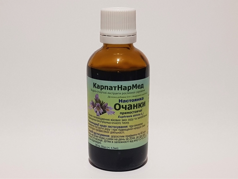 |     Настоянка Очанки прямостоячої      Настойка Очанки  прямостоячей - Tinctura Euphrasia stricta (L.) -  Настоянка Очанки прямостоячої     Химический состав. Трава очанки лекарственная  содержит масла: 6% жирного и 0,15—0,17% эфирного, от 3 до 8% галлотанинов, а  также горечи, синее красящее вещество, смолы, танины, иридоиды, лигнаны,  ароматические кислоты, флавоноиды.     Благодаря присутствию танинов очанка оказывает вяжущее  действие, противовоспалительные свойства связаны с присутствием в растении  иридоидов, кроме того, растение оказывает тонизирующее действие.     В народной медицине препараты очанки применяются наружно и  внутрь при заболеваниях и воспалениях глаз, воспалениях век, слезных мешочков,  при пятнах на роговице, ячменях, при конъюнктивитах и усталости глаз.     Препараты очанки обладают способностью восстанавливать  механизмы восприятия внешней среды роговицей глаза, нормализуют зрение, снимают  напряжение в глазном яблоке (ощущение «песка в глазах»). Обладают болеутоляющим  и антисептическим действием, эффективно стимулируют грануляции тканей,  эффективно применяют для лечения глаукомы, катаракты.     Препараты очанки активизируют уникальные восстановительные  процессы на тканевом уровне. Результаты лечения сохраняются в течении 3-5 лет,  чего трудно добиться при лечении другими препаратами. Препараты очанки  обыкновенной помогут сохранить здоровое зрение или значительно улучшить его  качество, даже если нагрузки на зрение достаточно высоки. Можно применять  взрослым и детям.     Также очанка рекомендуется при воспалении слизистой  	оболочки бронхов, при хриплом голосе, при нарушениях пище варения,  	отсутствии аппетита, катаре желудка, повышенной кислотности желудка и  	желтухе.Используют очанку для лечения насморка, детских экзем, диатеза.