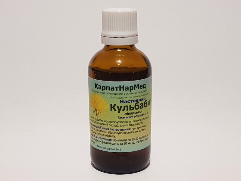 |     Настоянка Кульбаби лікарської      Настойка Одуванчика  лекарственного - Tinctura Taraxacum officinale (L.)     Химический состав. Корни одуванчика  лекарственного содержат горькое вещество тараксацин (до 10%), сесквитерпеновые и  тритерпеновые соединения (тараксерол, тараксастерол, андростерол и др.),  стерины (Р-ситостерин, стигмастерин), флавоноиды (космоизин,  лютеолин-7-глюкозид), никотиновую кислоту, инулин (до 24%), каучук (до 3%),  жирное масло, слизь и др. В соцветиях и листьях растения содержатся каротиноиды  тараксантин и флавоксантин, тритерпеновые спирты арнидиол и фарадиол, флавоноиды,  аскорбиновая кислота (до 50 мг%), какфлавин, соединения железа, кальция и  фосфора.     В научной медицине препараты одуванчика применяются в  качестве средства, повышающего аппетит и улучшающего пищеварение. Действующие  вещества одуванчика раздражают вкусовые рецепторы, вызывая рефлекторное  выделение желудочного сока и секретов других пищеварительных желез. Кроме того,  одуванчик усиливает желчеобразование, обладает мочегонным, спазмолитическим и  слабительным свойствами, в связи с чем применяется при холецистите,  гепатохолецистите, анацидном гастрите, усложненных патологией гепатобилиарной  системы и хроническими запорами. Корни одуванчика лекарственного входят в состав  аппетитных, желчегонных и мочегонных сборов.     Галеновые препараты одуванчика эффективны в профилактике  общего атеросклероза. Как отдельно, так и в смесях с листьями черники  обыкновенной, крапивы двудомной и створок (стручков) фасоли обыкновенной  одуванчик назначают при сахарном диабете (в начальных стадиях). В дерматологии и  косметологии настой корней рекомендуется употреблять внутрь при угревой сыпи,  фурункулах и медикаментозном дерматите, а также в качестве наружного средства  для удаления веснушек.     В народной медицине препараты одуванчика применяются при  желчнокаменной болезни, воспалении или закупорке желчных путей, непроходимости  кишечника, плохом пищеварении, циррозах, гепатитах, задержке жидкости в  организме, фурункулезе, экземе, кожных сыпях, подагре, ревматизме, для  активизации функции почек и печени.     Способы применения и дозы: