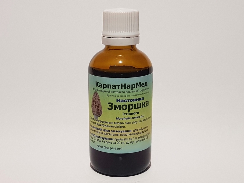 |     Настоянка Зморшка їстівного     Сморчок настоящий (обыкновенный, съедобный) - Morchella  esculenta (L.) - Зморшок їстівний (ковпачок, сушеребок)     В лекарственных целях Сморчок используется, прежде  всего, в офтальмологии.     В наше время были произведены лабораторные исследования  состава грибов. По результатам работ подтверждены их полезные свойства.  Вещества, содержащиеся в Сморчках, не допускают помутнение хрусталика и  укрепляют глазные мышцы.     Хрусталик мутнеет с возрастом, интенсивность процесса в  каждом случае индивидуальная. По данным статистики, в возрастной группе от 50  лет катаракта развивается в 30-35% случаев. Лазерная микрохирургия, призванная в  свое время решить проблему посредством внедрения искусственного хрусталика,  сегодня занимается более сложными вопросами. Для населения медицина, в основном,  предлагает профилактические рекомендации – гимнастику для глаз и употребление  черники. Тогда как использование препаратов на основе Сморчка в 60% случаев  улучшает зрение, на 80% снижает риск вероятности катаракты и в некоторых случаях  даже осветляет хрусталик.     Использование Сморчка благотворно влияет на организм  пациента:- укрепляются мышцы глаз;