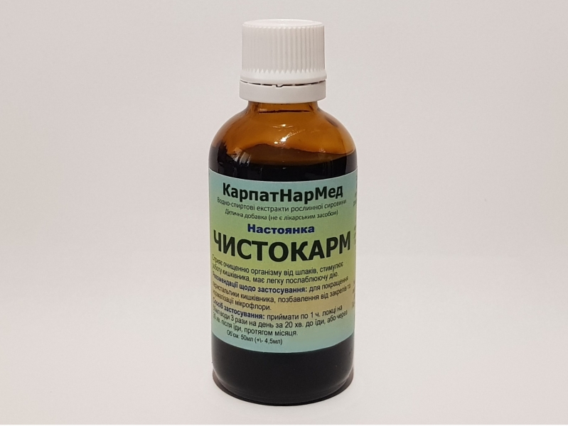 |     Hастоянка "ЧИСТОКАРМ" сприяє очищенню організму від шлаків, стимулює роботу кишківника, має легку послаблюючу дію.     Склад: водно-спиртовий екстракт суміші бобівника, буркуну, бузини чорної, гірчаку почечуйного, золототисячнику, кмину, кульбаби, крушини, м'яти перцевої, перстачу гусячиого, пижма, ромашки, рутки, морознику (1:10). Екстрагент: спирт етиловий 40%.     Рекомендації щодо застосування: для покращення перистальтики кишківника, позбавлення від закрепів та нормалізації мікрофлори.     Спосіб застосування: приймати по 1 ч. ложці на 50мл води 3 рази на день за 20 хв. до їди, або через 30 хв. після їди, протягом місяця. Після 2-х тижнів перерви курс можна повторити.     Дієтична добавка (не є лікарським засобом).     Протипоказання та застереження щодо споживання: індивідуальна чутливість до компонентів, вагітність, період лактації, дітям до 12-ти років.     Не перевищувати рекомендовану добову дозу.     Перед застосуванням рекомендована консультація лікаря.     Не слід використовувати як заміну повноцінного раціону харчування.     УВАГА! САМОЛІКУВАННЯ МОЖЕ БУТИ ШКІДЛИВИМ ДЛЯ ВАШОГО ЗДОРОВ'Я!
